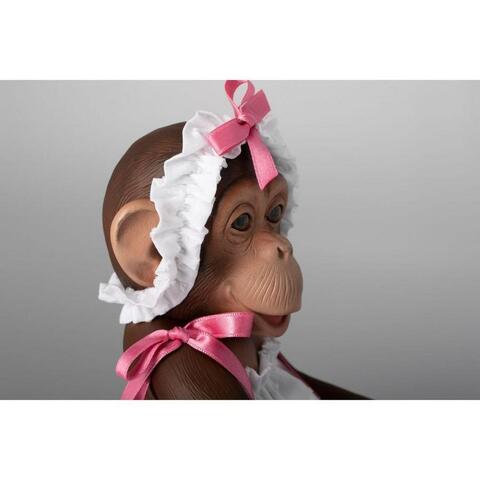 Шимпанзе Лола одета в красивый песочник на завязочках из атласных лент. На голове повязка в тандем к песочнику.
