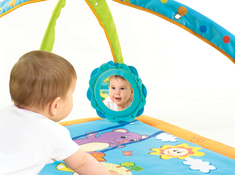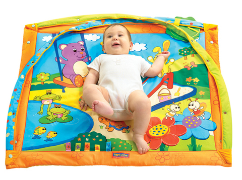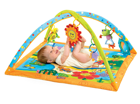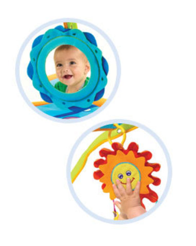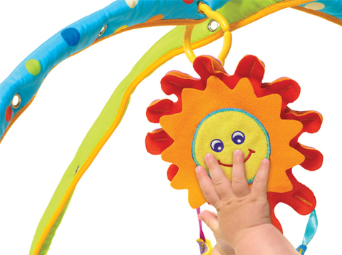 Яркий коврик с четырьмя игрушками, безопасным зеркалом и забавным солнышком с тремя мелодиями. Музыкальное солнышко реагирует на прикосновения ребёнка. Традиционная конструкция - мягкий квадратный коврик, перекрещивающиеся дуги с подвесными игрушками.