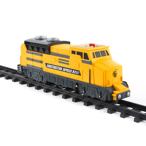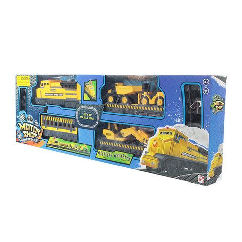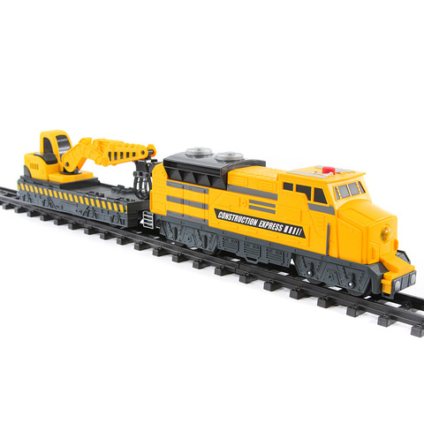 В комплекте: локомотив, 3 вагона, самосвал, погрузчик, экскаватор, 16 элементов полотна, аксессуары.