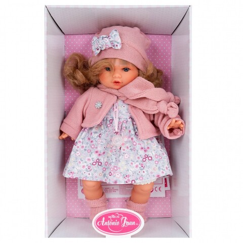 Марисела - очаровательная куколка-малышка размером 30см, созданная испанским производителем Мунекас Антонио Хуан. У Мариселы симпатичное личико, выполненное с тщательной прорисовкой деталей и выразительные голубые глазки, обрамленные густыми ресничками. Светлые густые вьющиеся волосы легко расчесывать и делать различные прически. Ее теплый комплект, выполненный в едином стиле, включает в себя платьице, вязанную курточку, шапочку, шарфик и носочки.