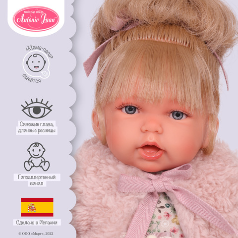 Кукла упакована в фирменную подарочную коробку с крышкой. Работает от 3-х батареек типа LR44 (входят в комплект). Munecas dolls ANTONIO JUAN - «королевский бренд» Испании. История этого бренда насчитывает более 60 лет и примечательна созданием в 2007 году куклы Леонор, моделью которой послужила наследная принцесса Испании. Это событие навсегда связало бренд Мунекас Доллс АНТОНИО ХУАН с испанской королевской семьей. На шее куклы стоит фирменный штамп производителя.