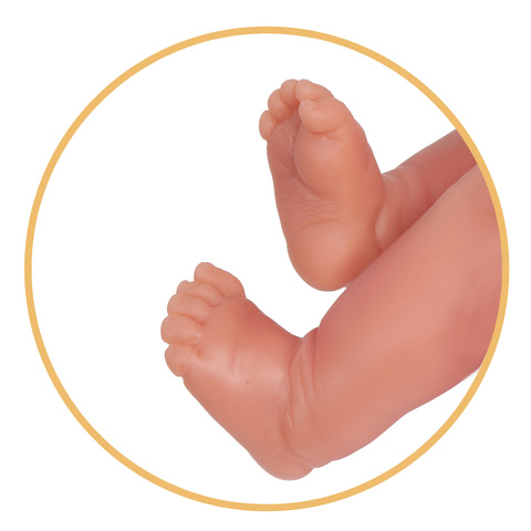 У куклы сияющие серые глаза и милое личико. Малышка полностью выполнена из гипоаллергенного винила высокого качества. Ручки и ножки у куклы подвижные, она - девочка (есть гендерные признаки). Одета в свитер и трусики, на голове шапка. В комплекте текстильная сумочка-переноска.