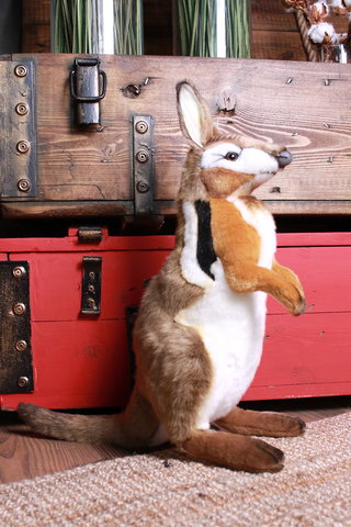 Это животное очень похоже на кенгуру, и оно не случайно, ведь валлаби относятся к семейству кенгуровых, правда обладают меньшим размером. Приятный на ощупь и аккуратно изготовленный, этот малыш выглядит весьма реалистично, что даже на мгновение может показаться, как будто он вот-вот оживет и отпрыгнет в сторону.