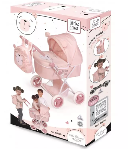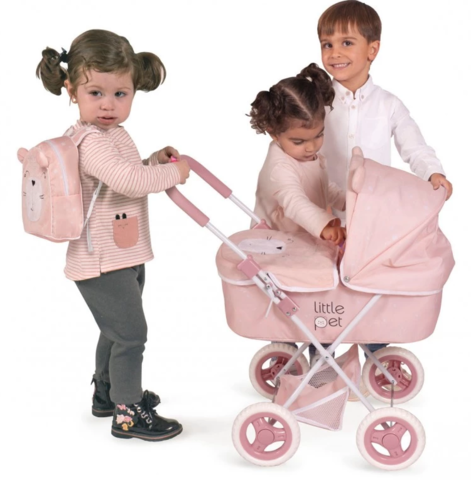 Коляска для кукол с рюкзачком серии Литл Пет, 60 см понравится каждой девочке. Это классическая коляска для кукол высотой всего 60 см с люлькой-качалкой. Она подойдет для самых миниатюрных девочек. Коляска нежно-персикового цвета с плюшевыми деталями на козырьке и очаровательными ушками. У коляски металлическое складное шасси, прорезиненные колеса, удобная сетка внизу для вещей.