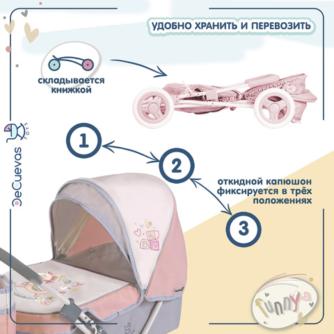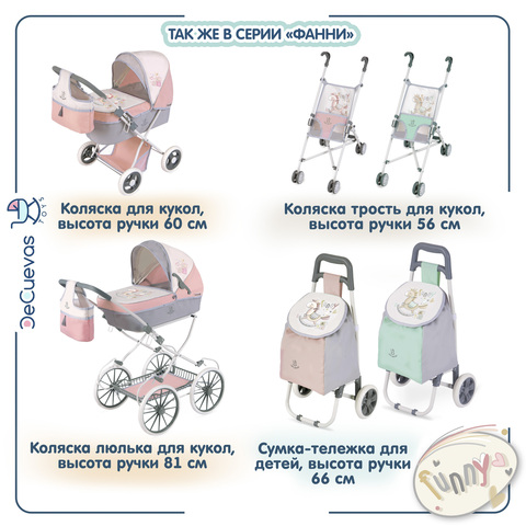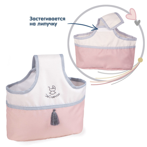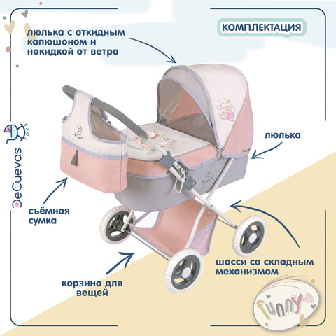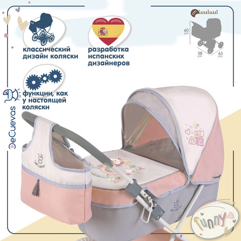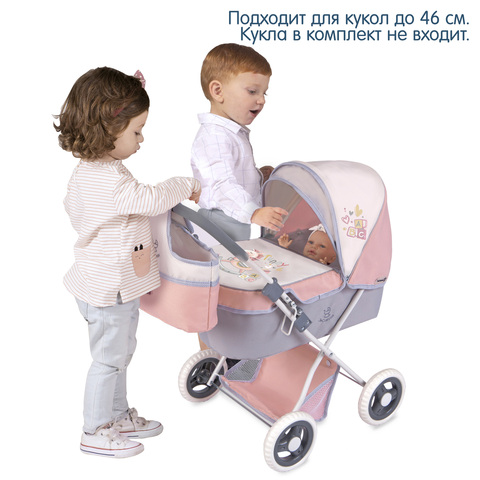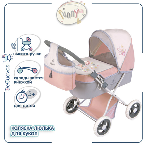 Коляска для кукол люлька со съемной сумкой и корзиной для мелочей. Вмещает куклу размером до 46 см. Серия "Фанни", цвет розовый, серый, белый.