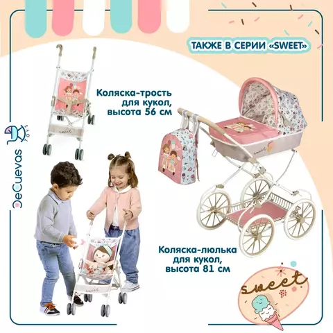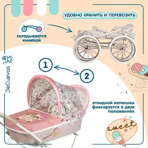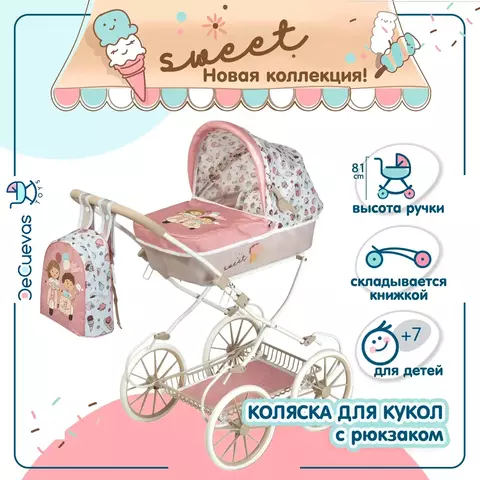 Мороженое, торты, пончики, смузи – яркие принты новой серии колясок с аппетитным названием Sweet! Дизайнеры бренда DeCuevas Toys создали необычную, оригинальную коллекцию, которую и родители, и дети оценят за качество, функциональность, красоту и легкое ванильное настроение. Маленькие сладкоежки будут в восторге!