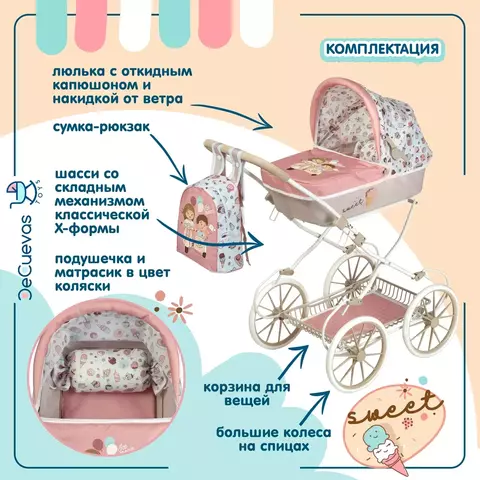 Коляска для кукол люлька испанского бренда DeCuevas Toys (ДеКуэвас Тойс) со съемной сумкой-рюкзаком – новинка серии Sweet. Высота от пола до ручки 81 см.