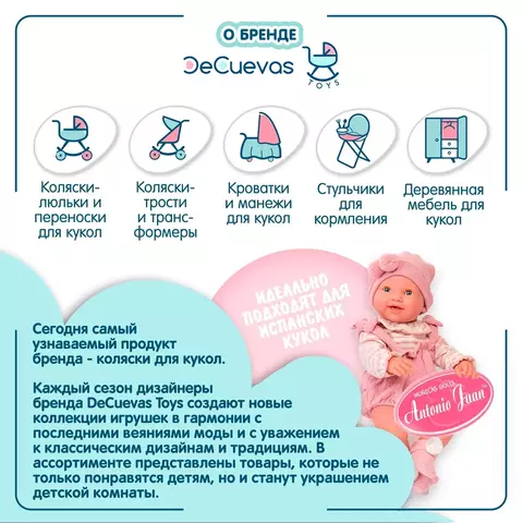 Самый узнаваемый продукт бренда DeCuevas Toys – коляски для кукол. Каждый сезон дизайнеры бренда создают новые коллекции игрушек в гармонии с последними веяниями моды и с уважением к классическим дизайнам и традициям. Коллекции колясок создаются так, чтобы можно было легко подобрать коляску под рост ребенка, учитывая высоту ручки коляски.
