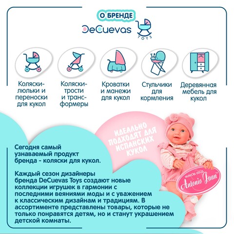 В ассортименте бренда представлены разные типы игрушечных колясок: коляски-люльки, коляски-переноски, коляски-трости, коляски-трансформеры, а также кроватки, деревянная мебель для кукол и другие игрушки, которые не только понравятся детям, но и станут украшением детской комнаты. Игрушки DeCuevas Toys подходят для испанских кукол бренда Munecas dolls ANTONIO JUAN.