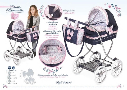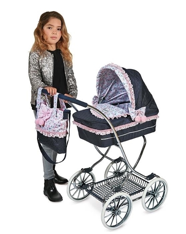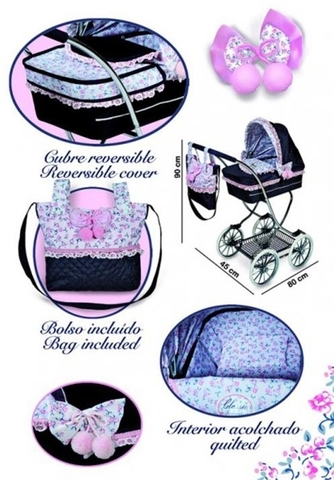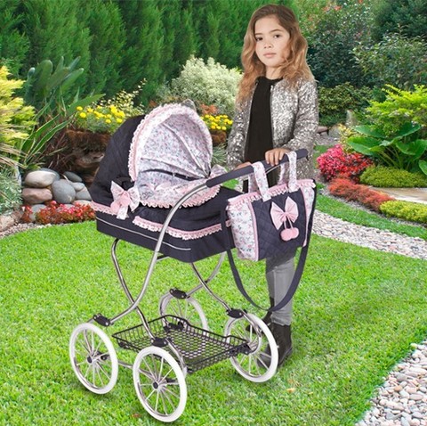 Чехол коляски двусторонний, поэтому ребенок сможет изменить стиль изделия, просто накрыв люльку противоположной стороной текстильной накладки. Капор защитит куколку от солнечных лучей. Мягкая красивая подушечка, находящаяся внутри люльки, сделает прогулку для пупса удобной. Коляска оснащена корзинкой, являющейся частью металлической рамы. На поручне есть специальная мягкая накладка. В комплекте девочка найдет чудесную сумочку с бантиком, в которую она сможет поместить все необходимые вещи для прогулки с куклой. Данная сумочка имеет длинный ремешок, поэтому ее можно носить на плече, чтобы все необходимое было у ребенка всегда под рукой.