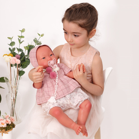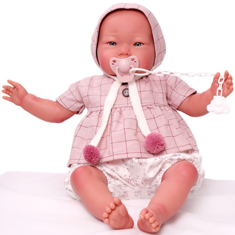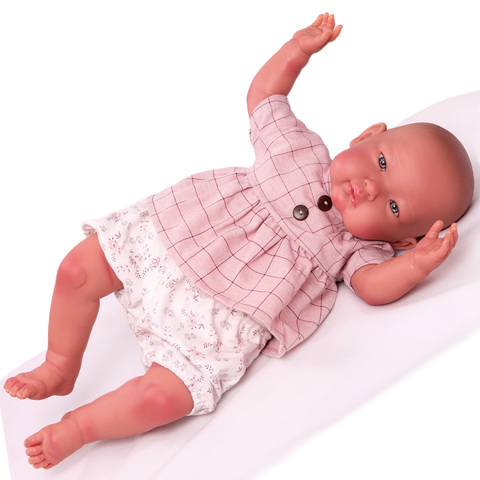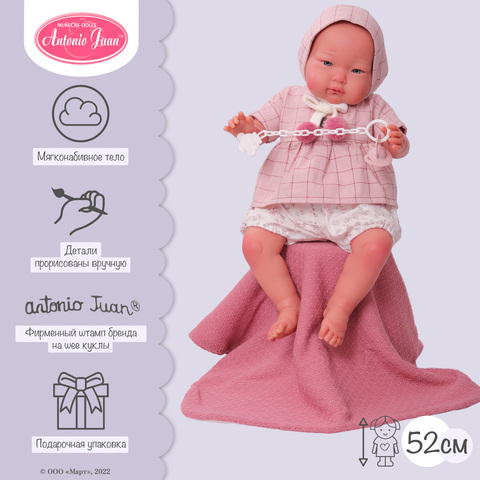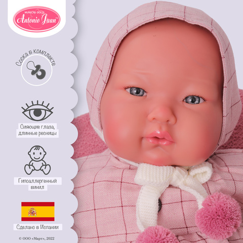Очаровательная кукла Эмилия - реборн младенец испанского бренда Мунекас доллс АНТОНИО ХУАН. Кукла стильно одета, в комплекте - соска с фирменным логотипом бренда. Тело куклы мягконабивное, а голова, ручки и ножки из гипоаллергенного винила, с бархатистой, как кожа младенца, поверхностью.