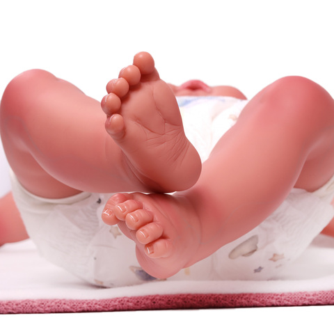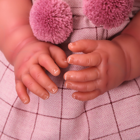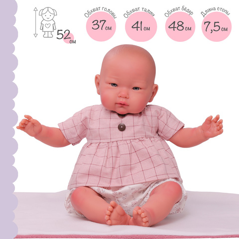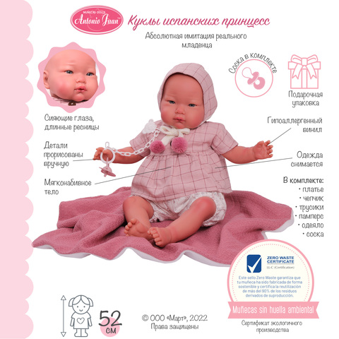 Реборн размером 52 см выглядит, как настоящий младенец. Волосы аккуратно прорисованы вручную. Особую реалистичность кукле придают сияющие глаза, длинные ресницы, блеск влажных капелек на губах, прорисованные вручную капилляры и нежный румянец на щеках. К каждой кукле прилагается сертификат о рождении, в который можно вписать имя и дату рождения куклы.