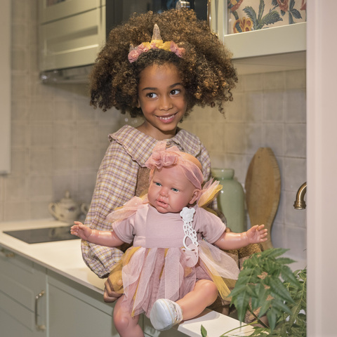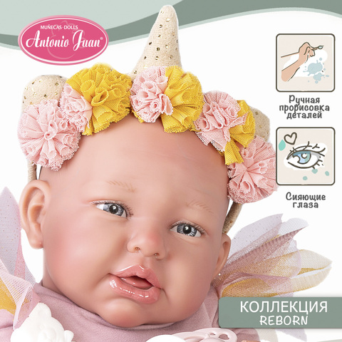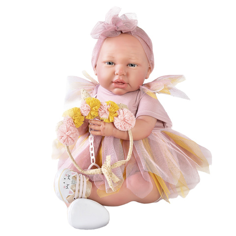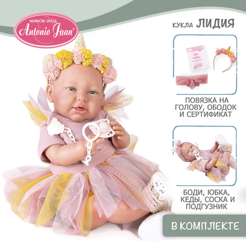 Комплектация: кукла, боди, юбка, кеды, повязка на голову, ободок, подгузник, сертификат о рождении, соска.