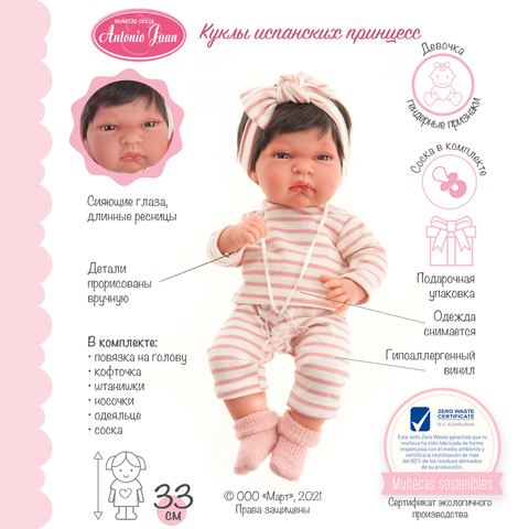 Очаровательная Тонета - кукла пупс размером 33 см испанского бренда «МУНЕКАС ДОЛЛС Антонио Хуан» удобна для детских ручек.
