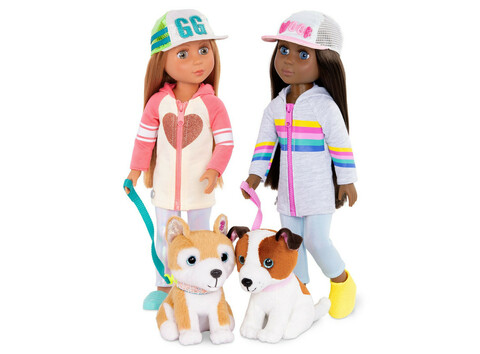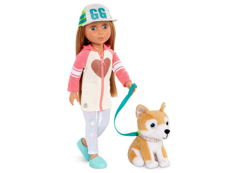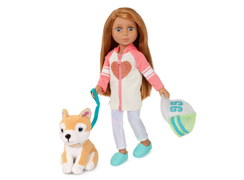 В комплект входят: кукла 35 см., платье, леггинсы, кепка, туфли, собачка 15 см., ошейник, крепящийся поводок.