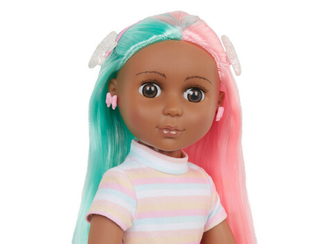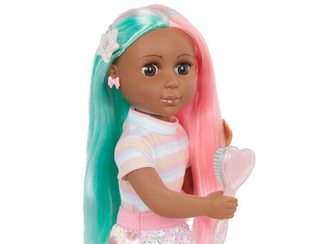 Подвижная кукла Жасмин с серёжками, которые легко менять по желанию, ожерелье куклы можно носить, как детский браслет. У куклы карие глаза и длинные розово-бирюзовые , которые можно расчесывать и укладывать.
