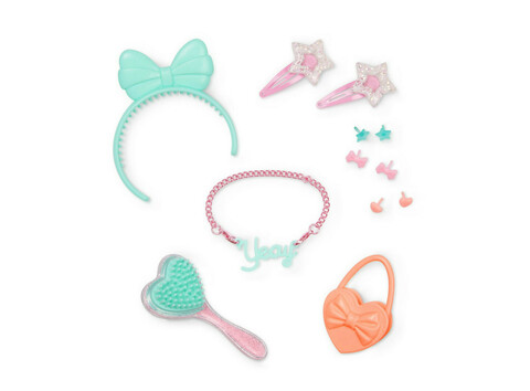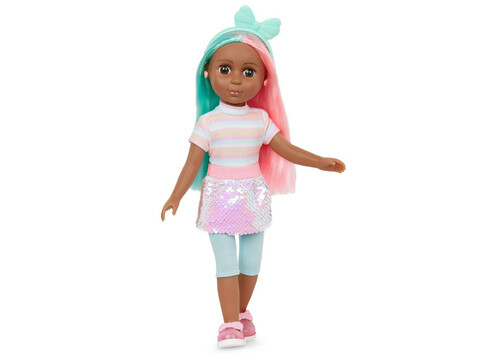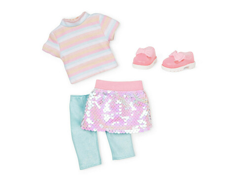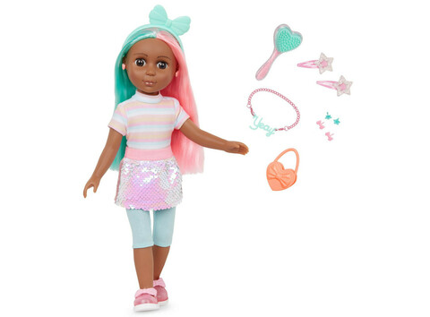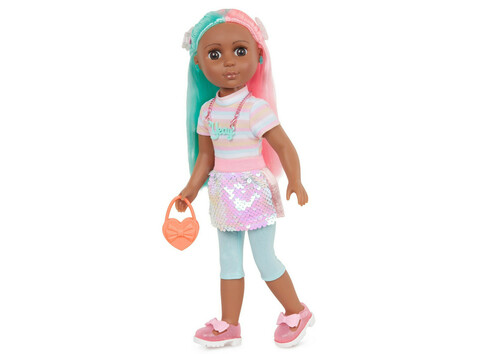 В комплект входят: кукла 35 см., водолазка, юбка, леггинсы, туфли, 3 пары съемных серёжек, ожерелье, сумочка, аксессуары для волос.