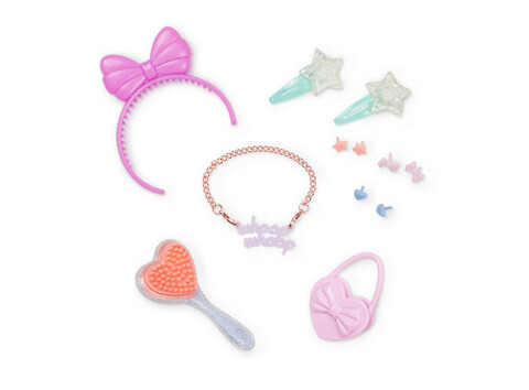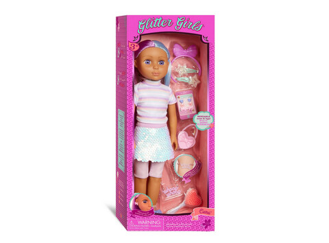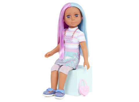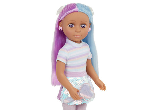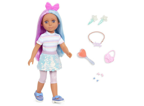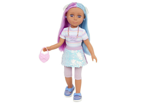 В комплект входят: кукла 35 см., водолазка, юбка, леггинсы, туфли, 3 пары съёмных сережек, ожерелье, сумочка, аксессуары для волос.