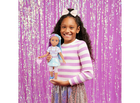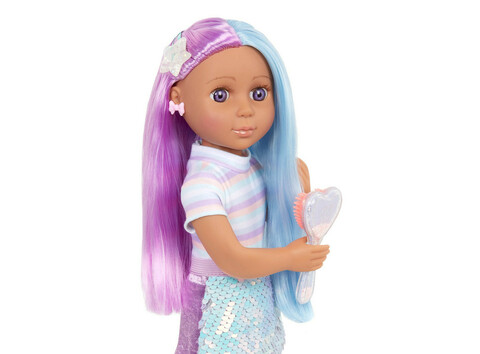 Подвижная кукла Сиара с серёжками, которые легко менять по желанию, ожерелье куклы можно носить, как детский браслет. У куклы фиалковые глаза и длинные фиолетово-голубые волосы, которые можно расчесывать и укладывать.