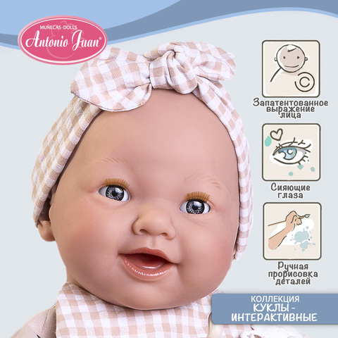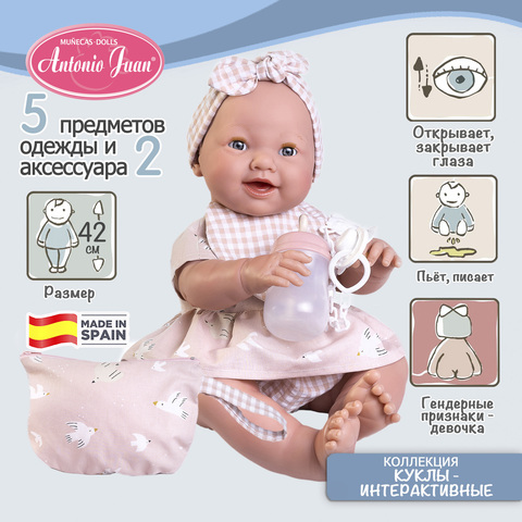Куклы Antonio Juan не требуют специального ухода — достаточно протереть их салфеткой, смоченной водой. Пожалуйста, не используйте салфетки с пропиткой, мыло и крем – это может повредить поверхность куклы.