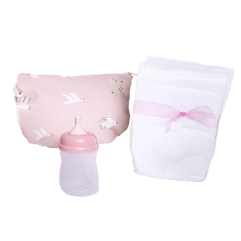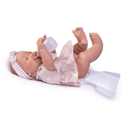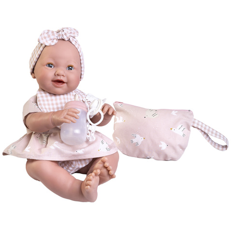 В комплекте: соска, повязка на голову, косметичка, бутылочка, соска, платье, трусики, слюнявчик, памперс. Ручки и ножки подвижные, у куклы есть гендерные признаки (девочка). Волосы тщательного прорисованы.