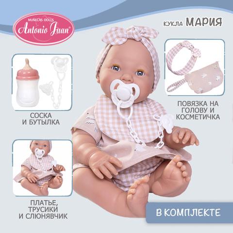 Мия Мария — интерактивная кукла испанского бренда Мунекас Доллс Антонио Хуан размером 42 см. Пупс с милым личиком и сияющими глазами, которые закрываются, полностью выполнен из гипоаллергенного винила высокого качества и копирует настоящего младенца. Если напоить куклу из бутылочки с водой, она пописает.