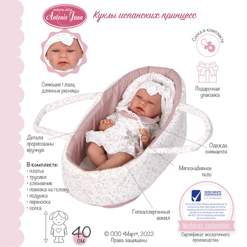 Милашка Джесси - кукла малыш испанского бренда Мунекас доллс АНТОНИО ХУАН размером 40 см. Кукла Джесси стильно одет, в комплекте - переноска и соска с фирменным логотипом бренда. Тело куклы мягконабивное, а голова, ручки и ножки из гипоаллергенного винила с бархатистой, как кожа младенца, поверхностью.
