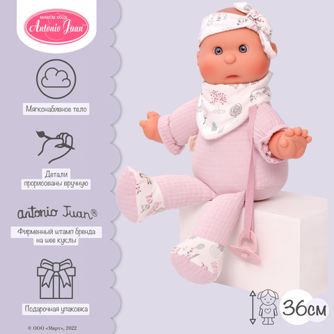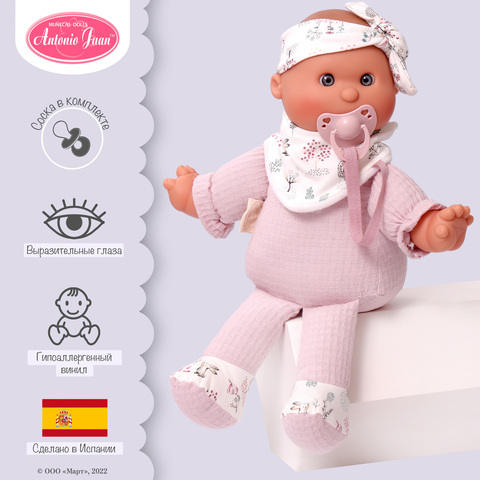 Забавная кукла младенец Мэри - новинка испанского бренда Мунекас доллс АНТОНИО ХУАН. В комплекте - соска с фирменным логотипом бренда.
