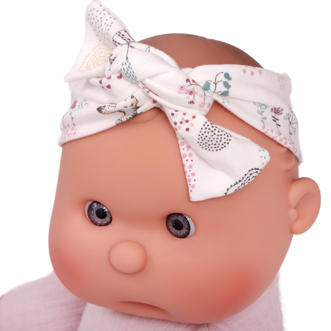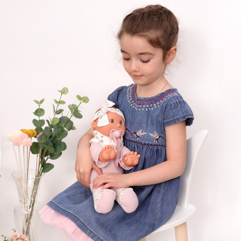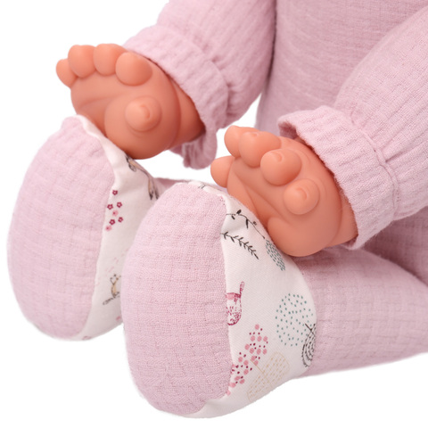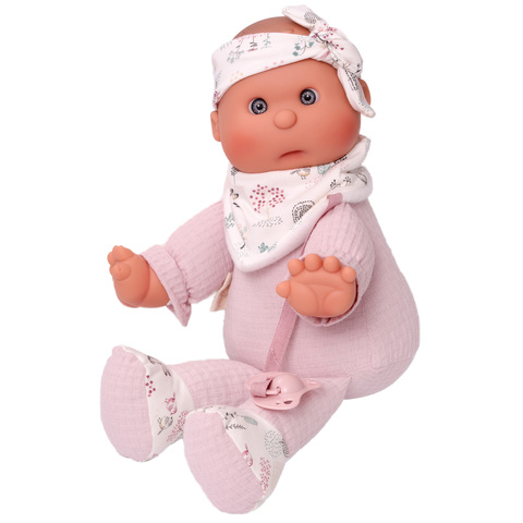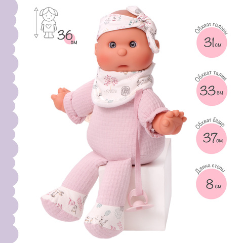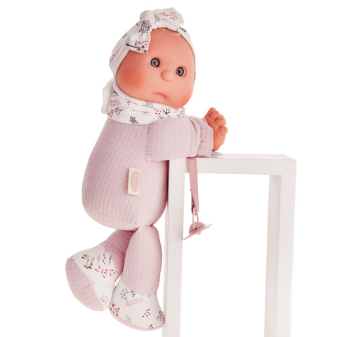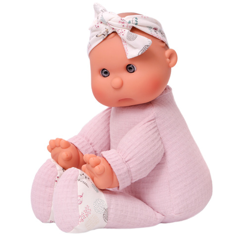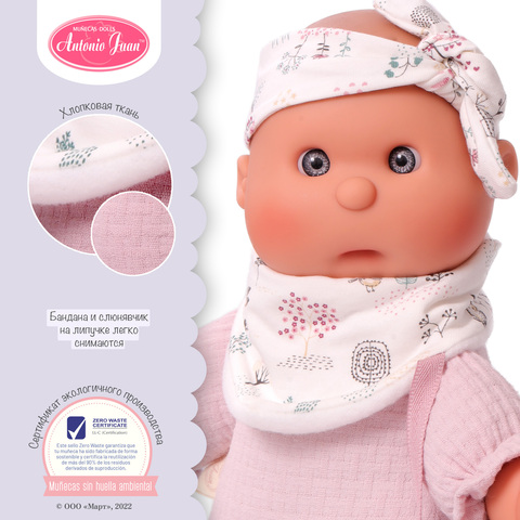 У куклы рельефная имитация волос на голове, выразительные глаза, нежный румянец на щеках. Мягкое тело куклы сшито из приятной хлопковой ткани и имитирует комбинезон с манжетами и пинетками. Повязку на голове и слюнявчик на липучке можно легко снять.