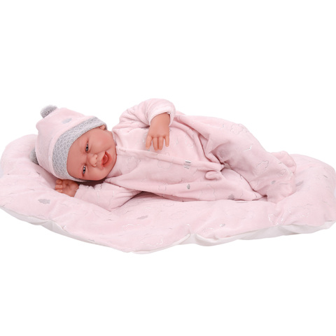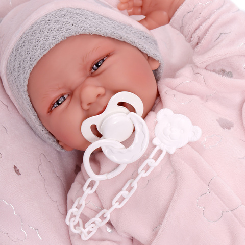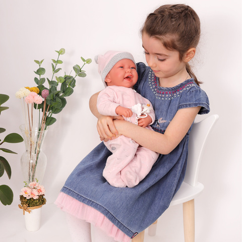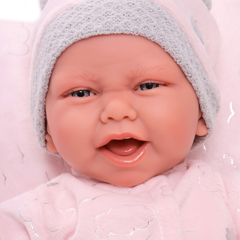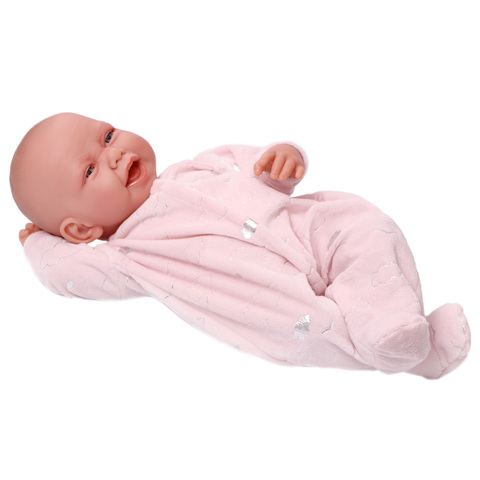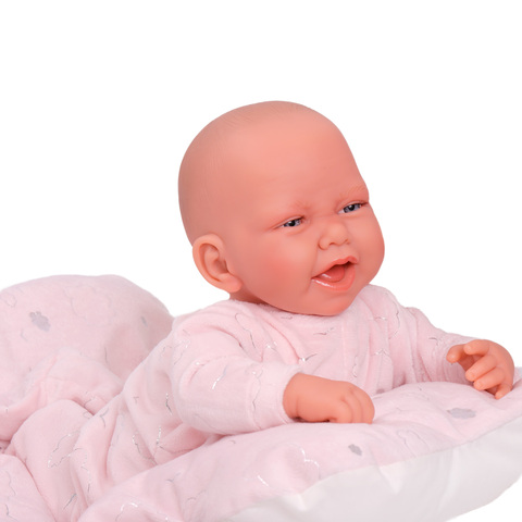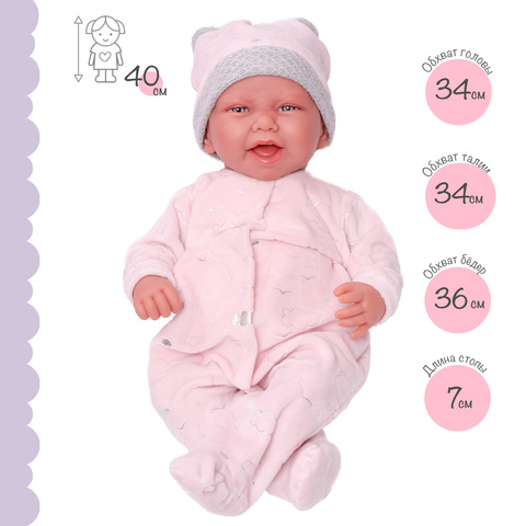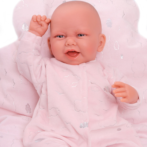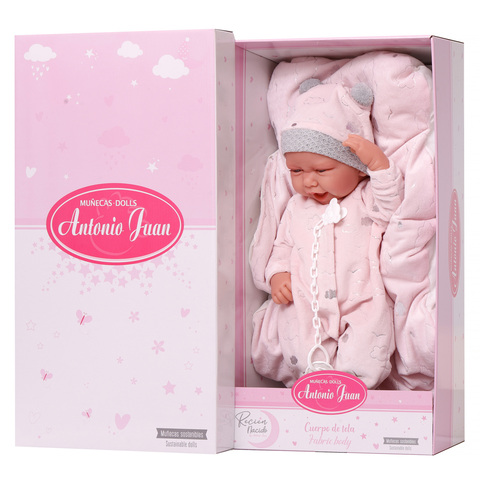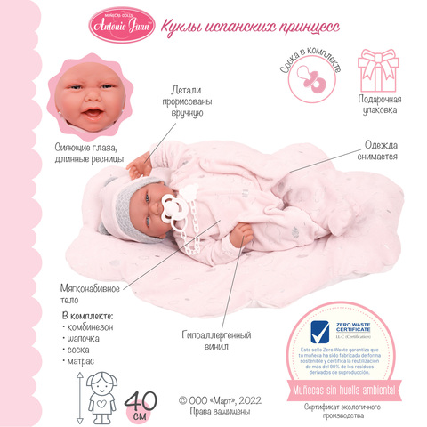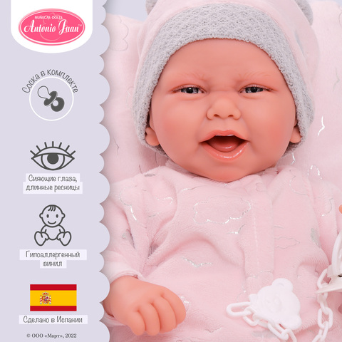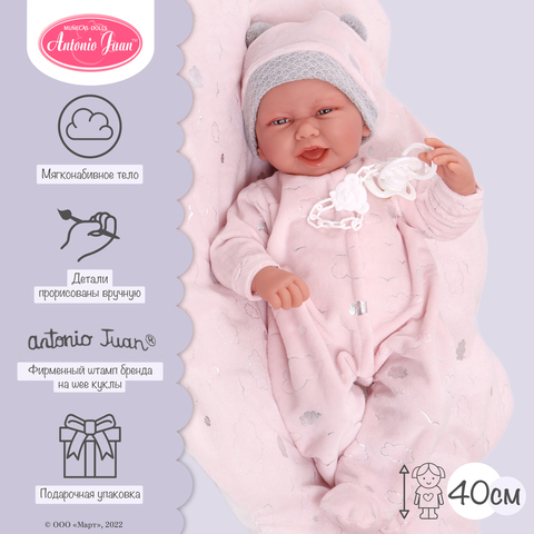 Малышка Паула - кукла младенец испанского бренда Мунекас доллс АНТОНИО ХУАН. Кукла Паула стильно одета, в комплекте - соска с фирменным логотипом бренда и набивной матрасик оригинальной формы. Тело куклы мягконабивное, а голова, ручки и ножки из гипоаллергенного винила с бархатистой, как кожа младенца, поверхностью.