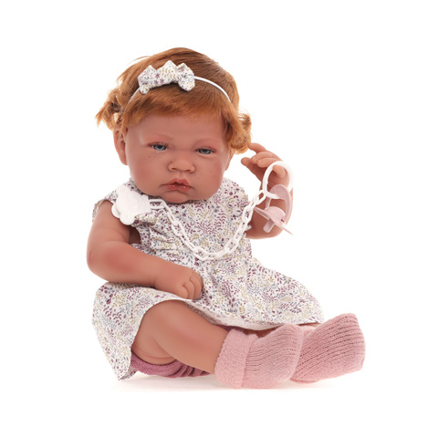 Ручки и ножки подвижные, у куклы есть гендерные признаки (девочка). Густые рыжие волосы легко расчесывать. Кукла одета в современную одежду для малышей, одеяльце в комплекте.
