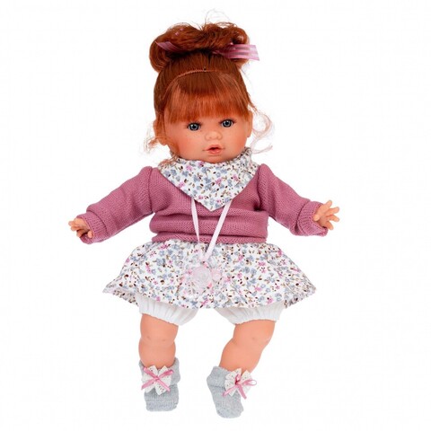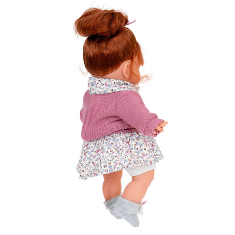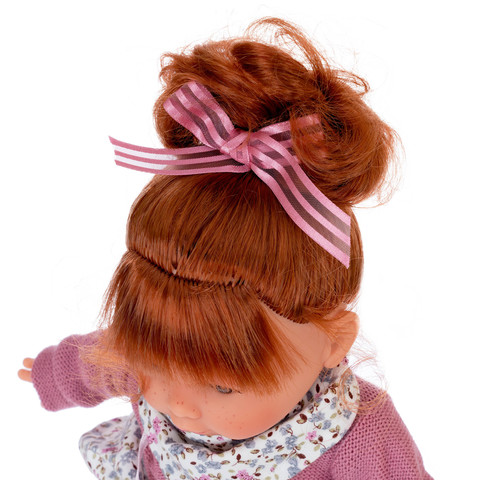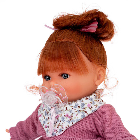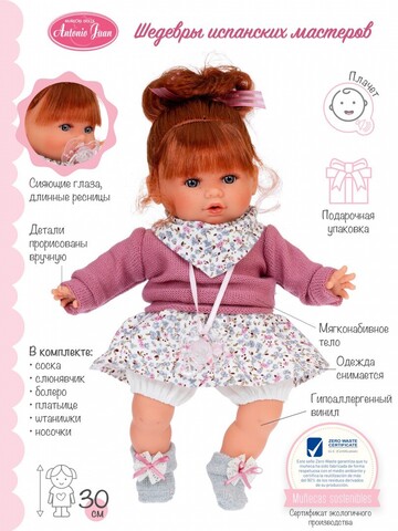 Клара - очаровательная кукла-малышка размером 30 см создана испанской кукольной фабрикой Мунекас Антонио Хуан. У Клары милое личико и голубые глазки. Густые рыжие волосы можно расчесывать и укладывать.Тело куклы - мягконабивное, а ручки, ножки и голова изготовлены из высококачественного винила.