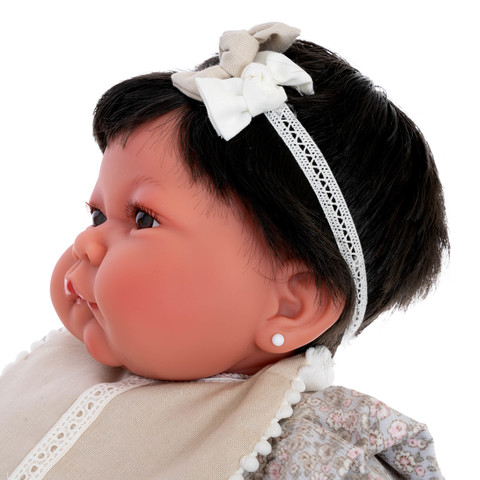 Мануэла - очаровательная кукла-младенец размером 40 см создана испанской кукольной фабрикой Мунекас Антонио Хуан. У Мануэлы симпатичное личико, карие глаза, обрамленные густыми ресницами и густая шевелюра, украшенная кружевной повязкой с бантом.