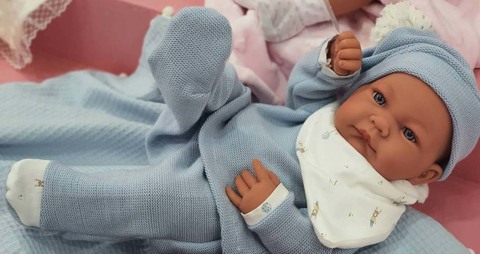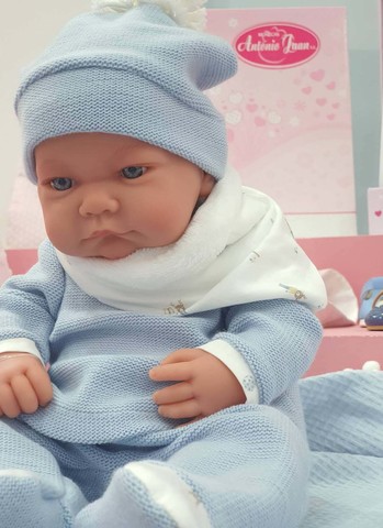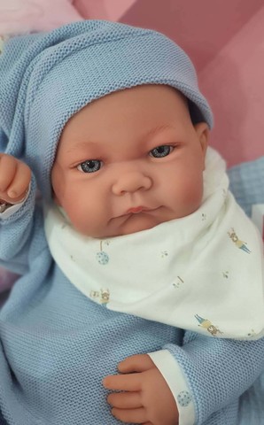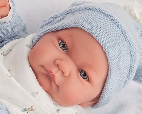Кукла Мио - очаровательный младенец размером 42 см, создан мастерами-кукольниками испанской фабрики Мунекас Антонио Хуан. У Мио симпатичное личико, выразительные голубые глаза с длинными ресничками.