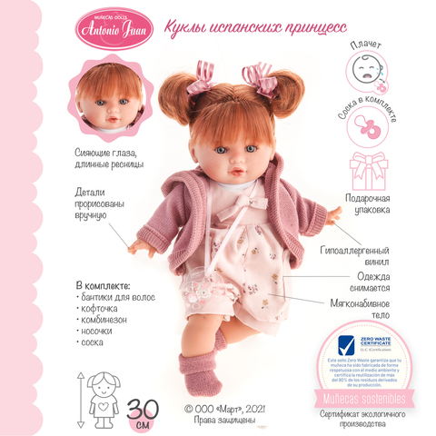 Куклы Antonio Juan не требуют специального ухода — достаточно протереть их салфеткой, смоченной водой. Пожалуйста, не используйте салфетки с пропиткой, мыло и крем – это может повредить поверхность куклы.