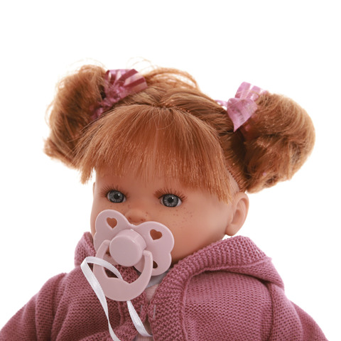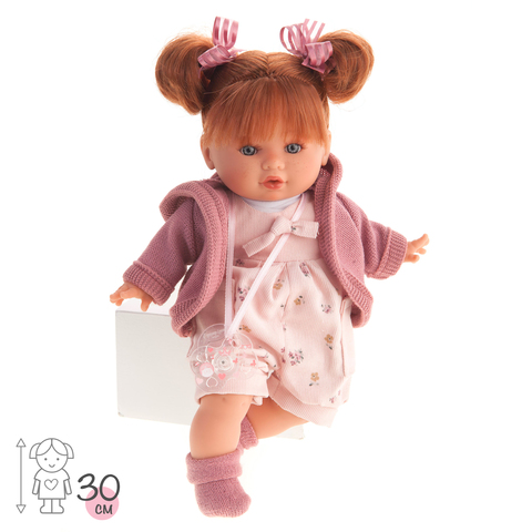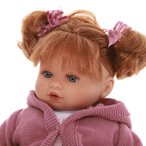 Оливия — озвученная кукла испанского бренда Мунекас Доллс Антонио Хуан размером 30 см. Она начинает плакать, если вынуть соску, которая идет в комплекте. У куклы сияющие глаза с длинными ресницами (приклены поштучно). Густые прошитые волосы легко расчесывать. Тело мягконабивное, а голова, ручки и ножки — из гипоаллергенного винила высокого качества. Оригинальная кукла снабжена штампом производителя. Кукла одета в современную одежду, ее можно переодевать. Упакована в фирменную подарочную коробку.