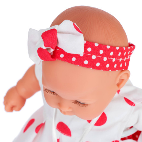 Модный комплект Памелы создан специально для нее испанскими дизайнерами и включает в себя стильное платьице в крупный горох, болеро, повязку на голову и носочки. Края одежды качественно обработаны: все детали - с внутренними швами.