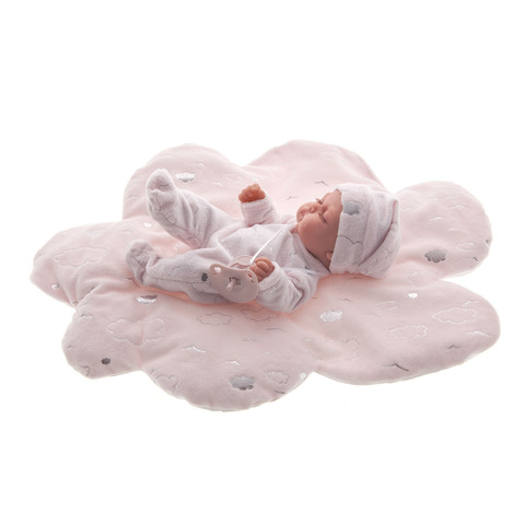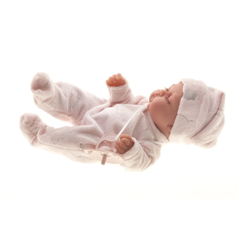Луни — кукла пупс испанского бренда Мунекас Доллс Антонио Хуан размером 26 см. Спящая малышка с закрытыми глазами и длинными ресницами полностью выполнена из гипоаллергенного винила высокого качества. Ручки и ножки подвижные, у куклы есть гендерные признаки (девочка). Волосы тщательного прорисованы. Кукла одета в современную одежду для малышей, одеяльце в комплекте.