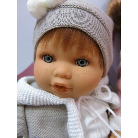- Кукла напоминает очаровательного малыша с яркими рыжими волосами, которые виднеются из-под шапочки и тщательно прошиты, что позволяет девочкам их расчесывать.