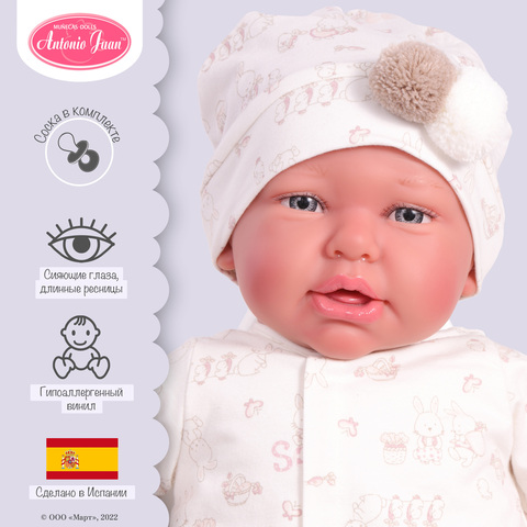 - На игрушке одет светлый костюмчик со слюнявчиком и шапочкой с декоративным принтом, аксессуары изготовлены из гипоаллергенного текстиля.