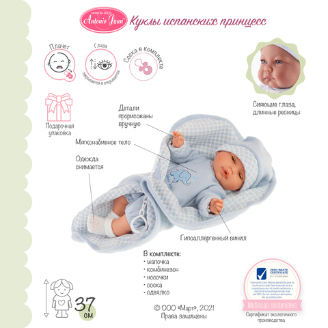 Образы малышей Антонио Хуан разработаны известными европейскими дизайнерами. Куклы натуралистичны, анатомически точны, с подвижными ручками и ножками, копируют настоящих младенцев. Тело куклы мягконабивное, а голова, ручки и ножки сделаны из высококачественного винила с покрытием софт тач, мягкого и приятного на ощупь.