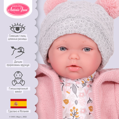 Милашка Лючия - шарнирная кукла испанского бренда Мунекас доллс АНТОНИО ХУАН. Кукла Лючия стильно одета, в комплекте - соска с фирменным логотипом бренда. Тело куклы - мягконабивное, а подвижные ручки и ножки - из гипоаллергенного винила с бархатистой, как кожа младенца, поверхностью. Гибкость куклы и возможность фиксации поз обеспечивает уникальная внутренняя конструкция на шарнирах.