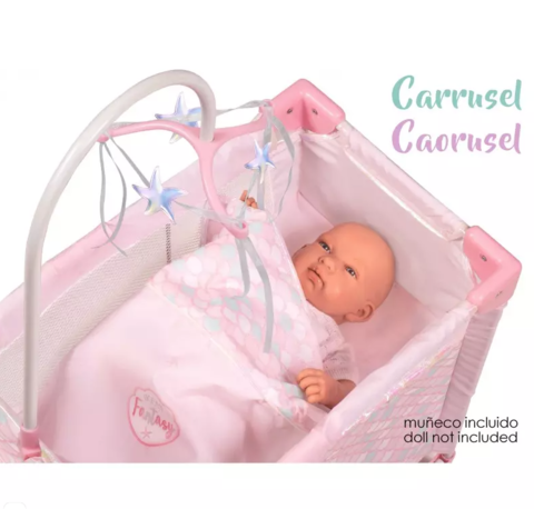 Центр для кукол выполнен в розовых тонах, отделан кружевом, бантиками. На кроватку установлен мобиль со звездочками (высота 34 см), чтобы куколка спокойно "засыпала". Внизу расположен шкафчик с 3 вешалками-плечиками и 3 полочки, куда можно складывать одежду и разные кукольные аксессуары. Высокий стульчик с подносом для кормления - в нем очень удобно кормить куклу из посуды, которая идет в комплекте (тарелочка, бутылочка, ложка и вилка).