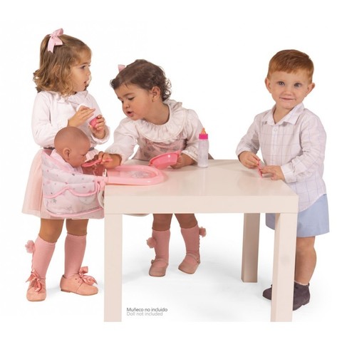 Набор выполнен в нежно-розовых тонах, а блестящие оборочки, бантики и тесьма придают очаровательный, сказочный вид, как у настоящей принцессы. Аксессуары для кукол, от испанского бренда Decuevas Toys, выглядят очень реалистично, как настоящие. Маленькая "мама" будет в восторге от такого подарка.