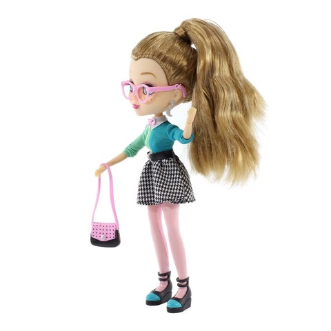 - Кукла наряжена в джинсовый комбинезон, зеленую водолазку, розовые гольфы и сапоги на шнурках. Дополнительными аксессуарами к ее наряду служат серьги и сумочка.
