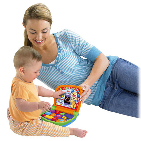 игра с ноутбуком способствует обучению. Малыш получает отклик, нажимая на клавиши, катая мышку или закрывая и открывая крышку, познавая алфавит, счет и многое другое.