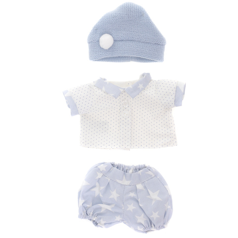 В комплекте: белая в горошек кофта из хлопка с голубой отделкой, голубая шапка из вязаного трикотажа, голубые штанишки из хлопка с принтом.