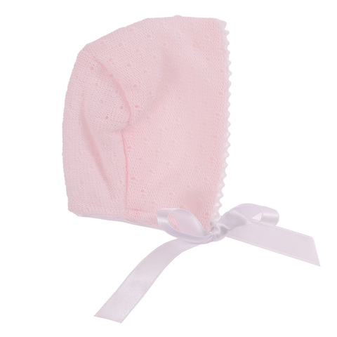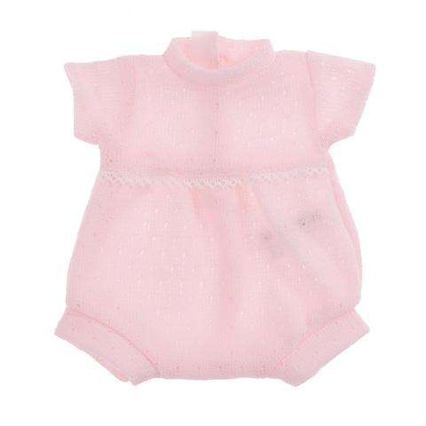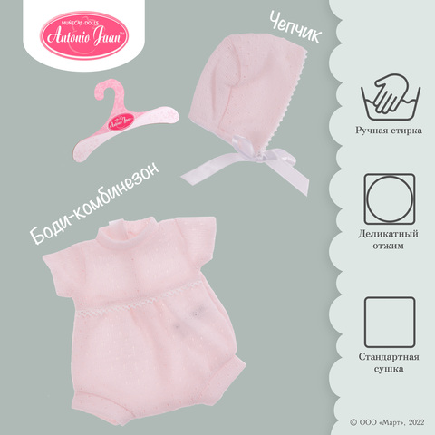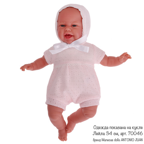 В комплекте: нежно-розовый вязаный боди-комбинезон с изысканной отделкой и чепчик.