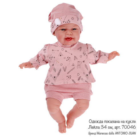 В комплекте: кофта с детским принтом, розовые шорты и шапочка с помпоном.