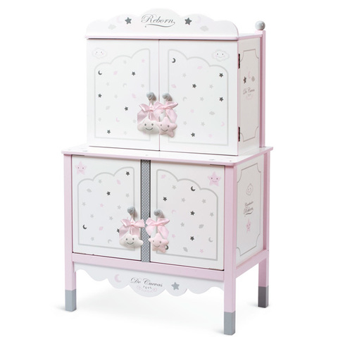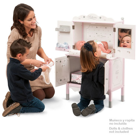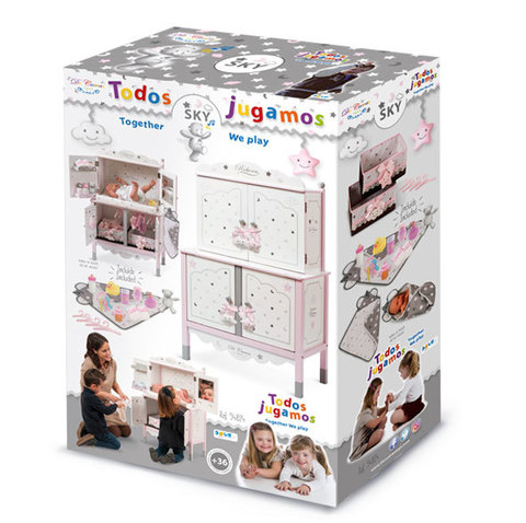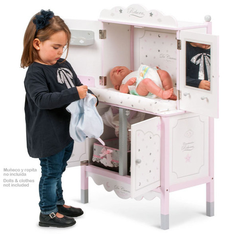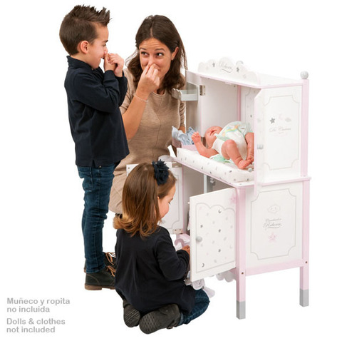 Игровой центр для кукол с аксессуарами DeCuevas - многофункционален. Дверки центра открываются, и он превращается в пеленальный столик, где можно переодеть куколку или уложить ее спать! На дверцах есть удобные полочки для аксессуаров, внизу шкафчик с вешалками и 2 корзинками для одежды. Также есть зеркало и множество аксессуаров, необходимых для ухода за куклой.
